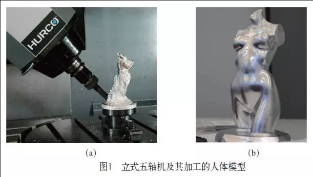 在高端装备中多轴五联动特别是对五轴机床来说,X、Y、Z这三轴应该保证设备在几何精度、动态精度、数控系统反响速度及驱动装置等方面,有良好的表现和机床硬件设计的合理性,才能够在此基础上实现从机械化到自动化,再加入多种元素后最终达到和实现多功能和智能化。实现五轴加工的机床形式、种类和配置有多种,图1所示为立式五轴机床及其加工的人体模型。