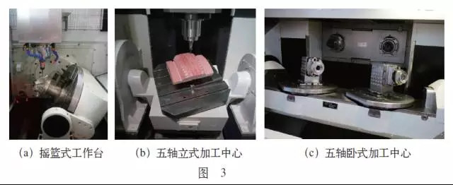 图2所示的涡轮和涡轴发动机叶片及类似产品,需要选择和更换机型来参与加工完成。图3所示为摇篮式工作台、五轴立式和卧式加工中心。