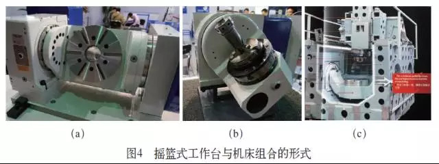 从图3所示的机床结构设计来看,除了机床有立卧之分,数控摇篮式工作台(A、C轴)形式和机床之间的配置方法也有所不同。通过不同的设计配置,可以达到加工能力的最大化,实现五轴联动铣削加工、车削加工以及钻、镗、铰、攻螺纹的多功能加工。在摆动的角度方面,有不同规格配置可以选择,有的转台可以360°运行,有的转台旋转轴为C轴且附带车削功能。对于用户,在使用和选择上首先会考虑机床主轴的功率及转矩,AC摇篮式工作台承重、回转精度、二轴的加工分度范围、支撑形式、夹紧方式及效果等,这是考核五轴加工机床的关键参数。为此,AC 摇篮式工作台根据用户产品的不同,设计成多样化的形式,与机床进行组合,在支撑方式上有单驱动无支撑、单驱动单支撑(也称单臂)及双驱动双支撑等;在驱动方式上有转矩电动机、蜗轮蜗杆等形式;夹紧形式分为碟刹、气刹及液压刹等。图4所示是数控摇篮式工作台(A、C轴)的两种组合形式,与机床整体组合式结构刚性要优于单个分体式组合结构。