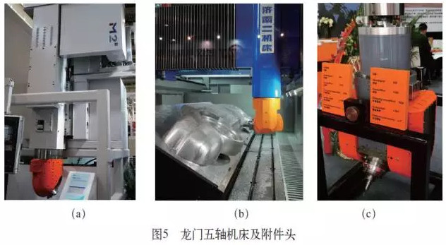 上述配置只适合中小零件的加工,对于较大和较长的零件则无法进行加工。许多机床厂家在五面体龙门加工中心的基础上,在Z轴的主轴上配置了AC 摆动头,以适合加工长零件和大零件。这种附件头可分为电气式和机械式。这种加工切削工艺的方法适合高速、轻载和轻切削,不适合重载、重切削,最大的缺馅是一旦配置五轴头,其他形式的附件铣头就不能更换使用,对箱体内腔的加工会产生一定的干涉。图5所示为龙门五轴加工中心及其附件头的形式。大型船用螺旋桨叶面、大型模具等产品就是采用数控五轴龙门式加工中心加工而成。