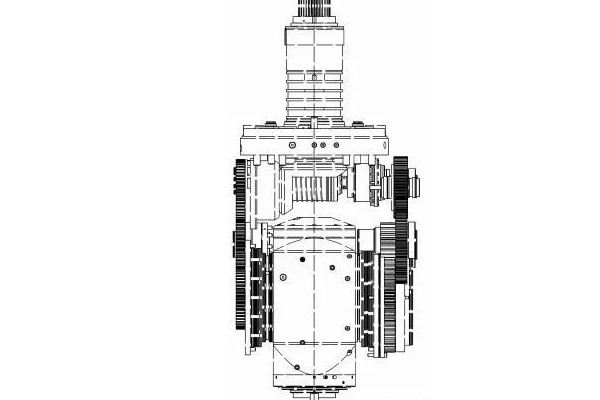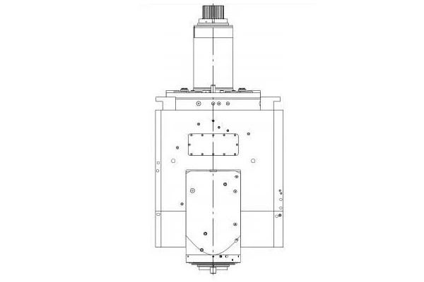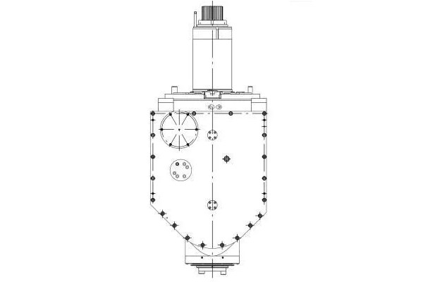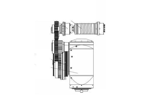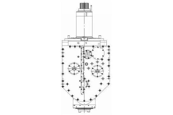 参看图 ,万能铣头壳体为中空设计,下 部中间位置安装刀具主轴,其特征在于万能铣头壳体两侧安装铣削动力齿轮机构和 B 轴动 力齿轮机构。