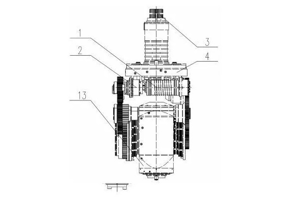 即 B 轴二级齿轮 轴 9 同时通过齿轮连接相同的双消隙齿轮 10,两个双消隙齿轮 10 采用反向预紧消隙后,连 接到 B 轴三级齿轮轴 11,B 轴三级齿轮轴 11 的输入端连接一个法兰盘 12,法兰盘 12 通过螺 钉把合连接到刀具主轴壳体 13 上,刀具主轴的旋转即形成所需 B 轴。