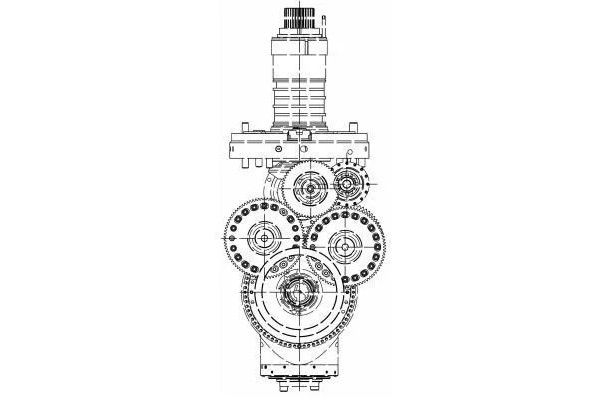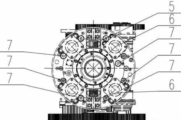 参看图 ,为万能铣头隐去万能铣头壳体的内部结构图。如图所示,图 2a 左侧安装 B 轴动力齿轮机构,右侧安装铣削动力齿轮机构。西门子内置电机 1 安装在万能 铣头壳体内,为 B 轴动力齿轮机构的动力来源,它的输出端连接行星齿轮减速机 2,减速比 为 i=22,减速机的输出端为法兰式输出,通过法兰盘连接 B 轴动力齿轮机构的输入轴。