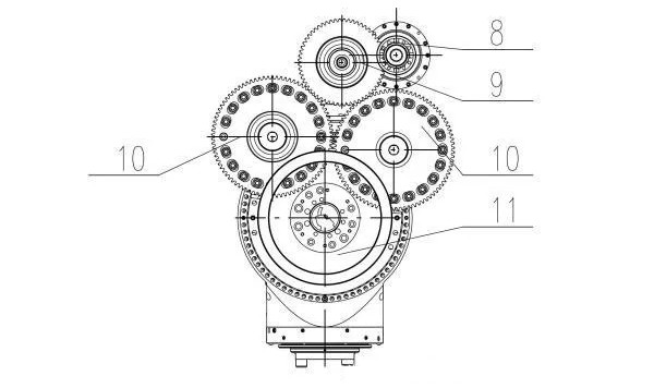 图 3a、图 3b 为 B 轴动力齿轮机构,B 轴动力齿轮机构的 B 轴内置电机 1 安装在万 能铣头壳体内,电机输出端连接减速比为 i=22 的行星减速机 2,减速机 2 的输出端连接 B 轴 一级齿轮轴 8,B 轴一级齿轮轴 8 通过齿轮结合连接到 B 轴二级齿轮轴 9, 由于 B 轴需要在 270 度范围内精确定位,所以 B 轴齿轮机构采用了机械双齿轮消隙的结构,