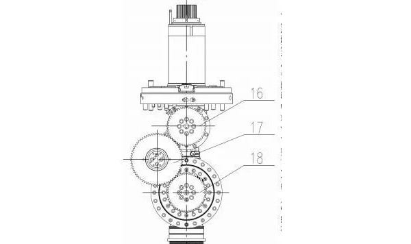 图 4a- 图 4b 为铣削动力齿轮机构,铣削动力齿轮机构的花键副 3 的下端安装第一 套伞齿轮副 14,通过过渡轴上的齿轮径向连接一至三级齿轮轴、一至三级齿轮轴径向连接 第二套伞齿轮副 :第一套伞齿轮副 14 连接到铣削一级齿轮轴 16,铣削一级齿轮轴 16 通过 齿轮连接到铣削二级齿轮轴 17,铣削二级齿轮轴 17 通过齿轮连接到铣削三级齿轮轴 18,铣 削三级齿轮轴 18 另一端安装第二套伞齿轮副 15,第二套伞齿轮副 15 连接到刀具主轴 19 上。B 轴内置电机将动力传递给行星减速机,经过降低速度增大扭矩的变化,
