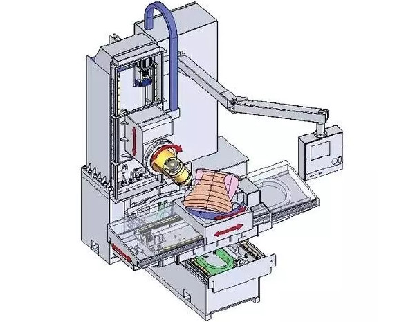 因此在龙门机床的三种结构中,工作台移动式龙门机床一般得不到高精度和高的表面质量;而龙门移动式机床在急加减速时会产生一个倾覆力矩,导致该结构不能有快速响应,否则会导致精度变化及过切。因此这两种结构均不适合大型工件的高精度五轴加工要求;横梁移动式结构由于运动质量可控且没有倾覆力矩,非常适合高速高精度加工,也是国际上普遍使用的大型高速铣和五轴龙门的结构。