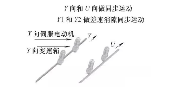 运动质量对伺服惯量比及加速度有本质性影响,如果运动质量产生变化,则惯量一定变化,亦即电气精度参数一定变化,而机床出厂时所确定的参数是依据调试时的负载而设定的,一旦运动质量有较大变化,伺服电动机的负载也产生变化,但此时用户一般无法调整这些参数,直接导致电气精度降低。此时所指高精度不是点位运动的精度,亦不是几何精度,而是插补精度即轮廓__图2 工作台移动式 图3 横梁移动式 图4 同向差速消隙同步运动精度。这就是客户在验收机床时工件精度合格,但放上较大工件后精度变化严重下降的问题所在。而横梁移动式机床由于运动部件的质量是恒定值,工件无论轻重都不影响各轴的伺服性能,因此在电气参数的稳定性和一致性上具有极高优势。