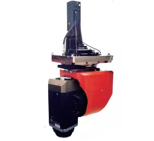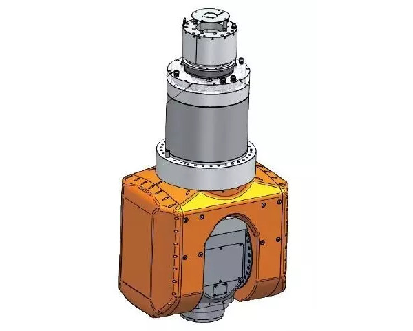 五轴头从形式上说有两种流行形式, 一种是双臂式( 见图6),另一种是单臂式(见图7),直观地看,双臂式由于A轴双边驱动,驱动力增大,但需要考虑大驱动力是否有实际应用意义。比如单臂的力矩是否也满足了应用要求,应考虑加工尺寸干涉,尤其是对一些内腔加工,往往双臂式会产生干涉,导致刀具加长。在一些特殊工件加工时,__由于单臂式的主轴中心到主轴外的尺寸很小,可以满足于狭窄尺寸,而且当C 轴旋转180°后,可实现对边狭窄位置加工,因此实际加工范围大于双臂式,这点需要用户重点考虑。但在有重切削尤其是难加工材料加工时,还是建议选择双臂式。如果双臂式不是双电动机驱动,应尽量避免选择,无驱动边不仅不一定能够起到支撑作用,还可能产生非线性阻力,影响精度和表面粗糙度。在选择双边驱动的双臂式五轴头时,还要注意双电动机的同步控制。