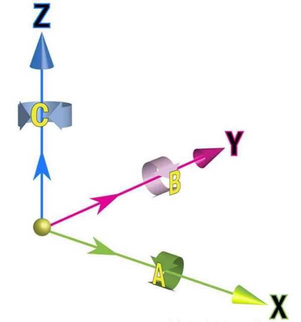 当使用3轴机床时,我们可以沿着X轴和Y轴移动刀具,同时使用Z轴上下移动。通过5轴加工,用户可以获得两个额外的旋转轴,这些旋转轴用字幕ABC来定义,A绕X轴旋转,B围绕Y轴旋转,C围绕Z轴旋转。由此我们可知还有6轴机器的存在,但通常添加第六轴并不会带来额外的好处,所以五轴配置更为常见。