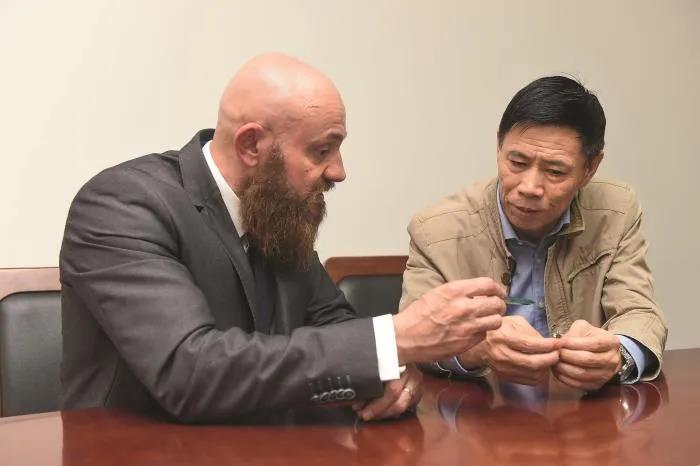 宝美市场部经理Stphane Violante(左)专访上海手术器械厂第三制造部部长姚锦华(右)
