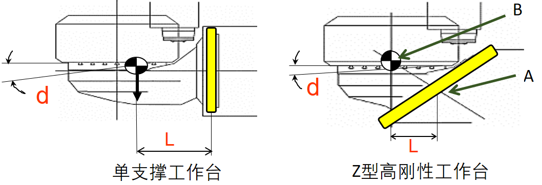 牧野的D200Z/D800Z/a500Z系列五轴加工中心采用了“Z”型高刚性工作台结构,如下图所示,工作台无需两端支撑,大直径倾斜轴承,工件重心B在A内。与传统单支撑结构相比,弯曲量d极微小,力臂L更短。