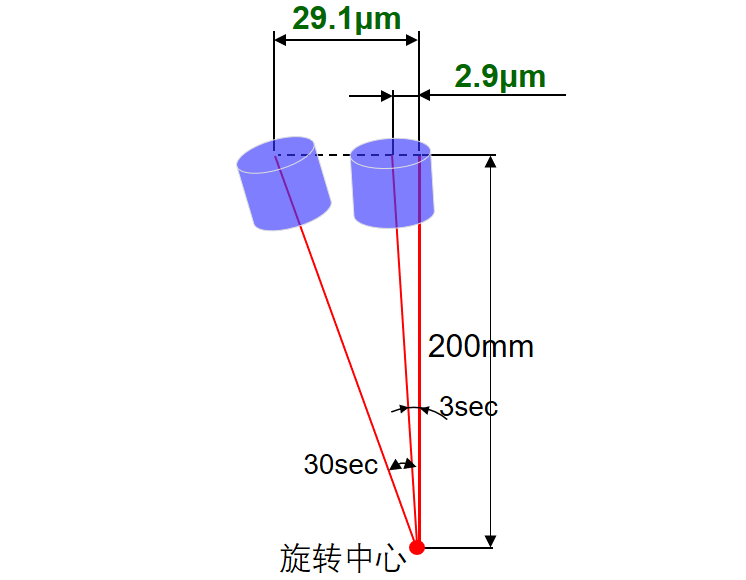 D800Z机床B/C轴的最小分辨率为0.0001度,也就是0.36″,定位精度为±3″,通过下面的计算示意图,我们就可以知道产生的精度误差。