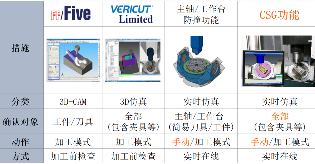 在线实时仿真CSG功能,在加工前可事先检查可能的工装错误或刀具长度的设置错误,以便将运行中的紧急停止降低至最小限度。运行中基于事先校对调整的数据、以及数控控制装置内的坐标、偏移值等读取位置信息,预测干涉可能性。一旦机床停止运行时,可即时显示状况画面、并确认所预测的干涉部位及轴的动作方向。