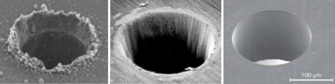 分别为纳秒激光、皮秒激光、飞秒激光加工的微孔