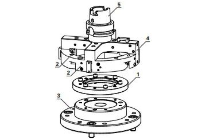 基准编码器的设计和制造都用于确定回转工作台的定位精度。图3是其结构式设计的示意图。基准编码器有一个光学扫描的栅鼓[1]和四个非接触式读数头[2]。扫描栅鼓位于回转工作台的中心并用适配器[3]安装固定,测量时回转工作台带动其旋转。读数头分布在安装座[4]中并用夹刀系统[5]固定在机床主轴上。