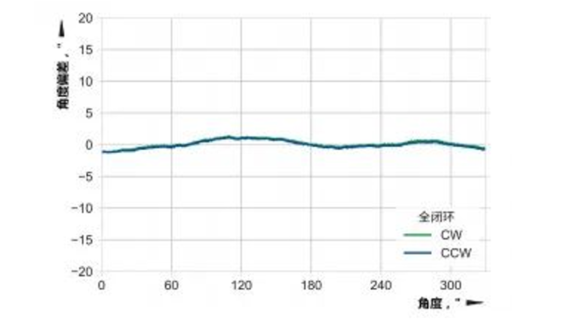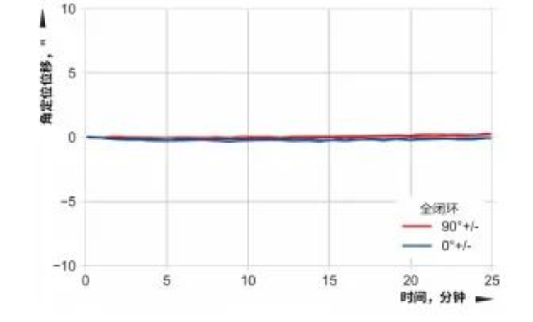 测量结果如图14所示,在全闭环控制中使用角度编码器,即使旋转轴进行周期性运动和传动链部件的温度升高,也能保持定位精度的稳定。在这种结构配置下,位置受温度影响并由角度编码器测量,并将测量结果反馈给位置控制环。该测量中的最大值为0.5″。