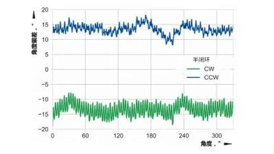 尽管被测的回转工作台通常在全闭环控制下工作,但是调整该机的参数也能轻松地在半闭环控制模式下定位该机床的工作台。因此,可以直接比较两种控制模式下的回转工作台的位置误差(参见图7和图8)。为进行比较,沿工作台圆周均匀分布720个测量点,首先进行双方向接近:顺时针(CW)和逆时针(CCW)。高分辨率的定位特性表现在位置一致性、位置独立性和在旋转轴定位中无系统性的影响。在全闭环控制中,旋转轴在整个角度测量范围内都能达到高定位精度,在正向和反向接近之间几乎难以区分接近方向。该测量曲线主要体现位置控制下的角度编码器工作特性。在半闭环控制下,双方向之间存在明显的反向误差,变化范围显著大于单方向接近。主要原因是机械传动部件中与位置相关的误差(例如间隙、摩擦和齿轮啮合因素)。顺时针测量中的高频振幅大于逆时针测量时的高频振幅,这表明齿面已磨损,这个现象与常用的旋转方向吻合。