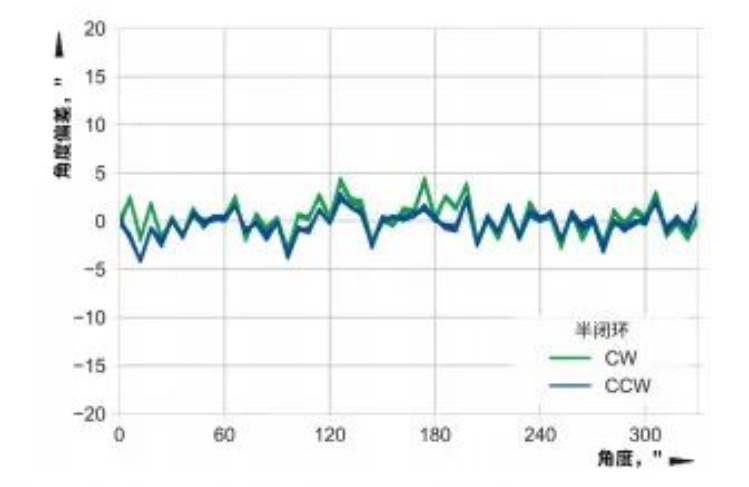 在机床数控系统上设置非线性误差补偿并将其激活后,现在两种控制模式下都达到优异的测量结果,达到可接受的精度等级(参见图11和图12)。全闭环控制下,精度提高到±0.35″。在半闭环控制下的测量中,整个转动范围上的位置误差较低,只有±1.4″。然而,1.0″的较小反向误差仍较明显。在这里,必须注意补偿值代表机床的离散状态,只适用于第一次测量,而且表中的测量值为静态值。但是在工作期间,由于热负载和机械负载以及机械部件磨损,机床状态和位置变化并不一致。因图13:根据ISO 230-2标准半闭环控制下的位置误差 (60个测量点,用补偿)此,经过一段时间后,用静态表补偿位置误差将难以达到图11和图12中的高质量。