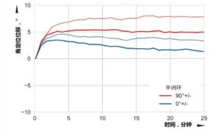 根据ISO 230-3标准,每种控制模式下进行的测量表明:旋转轴传动链及旋转轴的其它机械部件发热导致位置漂移。在该测量中,在机床数控系统中根据前面介绍的采样点激活补偿。此外,还根据ISO 230-3标准确定位置漂移对旋转轴精度的影响。为此,定义两个位置(0°和180°)并从两个方向接近(顺时针和逆时针)。在各次测量之间,用3000 °/min的进给速率进行5次周期性运动,使该测量范围(0°至180°)的温升达到要求。连续记录测量值直到回转工作台的位置停止热漂移。
