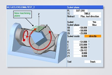摆动循环 CYCLE800 可实现静态平面的转换,可在 5 轴机床(例如摆头或摆台)上定义空间中的旋转工作平面。在该工作平面上您能进行 2D 或 3D 的操作和加工。参与转换的 2 个旋转轴只进行定位而仅线性轴在加工时移动的方式被称为 3+2 轴定位加工。通过调用合适的 NC 功能,循环可将激活的工件零点(如 G54)和刀具偏置转换到旋转平面上,并计入机床的一系列几何偏移,从而将实际的旋转轴法线定位到编程平面上。
